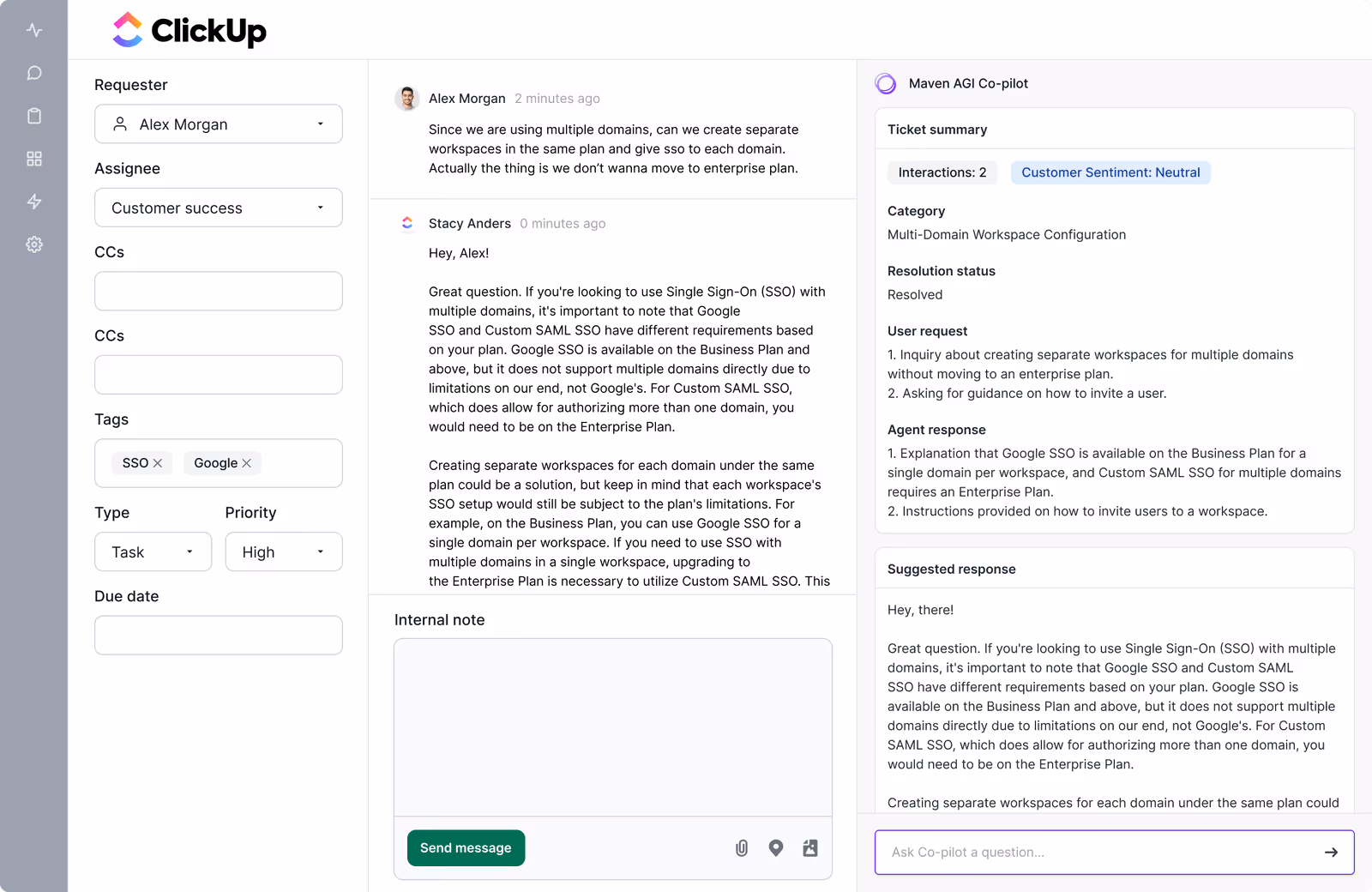 In search of a comprehensive solution, ClickUp's Head of Support, David Doyle, explored various AI tools that could streamline their support processes. After rigorous testing and trials of multiple solutions, Maven AGI stood out for its seamless integration with ClickUp's existing systems and its ability to provide value without increasing the reps' workload. Maven's agent co-pilot is the most intelligent on the market, offering instant summaries and suggested responses, and proved to be a game-changer.
