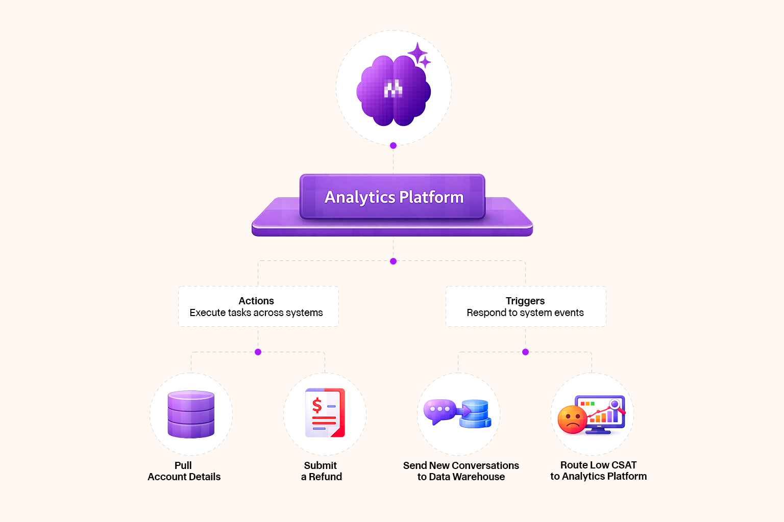 Actions let agents complete tasks on behalf of users. A support agent can pull a customer's unified profile mid-interaction, query payroll records, retrieve order history, or create a new workplace, all through natural language, without a team member stepping in manually. Because actions follow a standardized structure, teams can build and extend them quickly, connecting agents to any internal or external system on their own timeline.